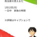 - 政治家の日常 1月12日(月)政治家の見える化 1月12日(月)一日中 家族の時間 新年の挨拶問題が話題のようです。個人的には来賓挨拶なんて… 続きを読む: 政治家の日常 1月12日(月)