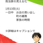 - 政治家の日常 1月13日(火)政治家の見える化 1月13日(火)一日中 お店の買い出し 町の雑務 家族の時間 社保問題などがクロ… 続きを読む: 政治家の日常 1月13日(火)