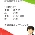 - 政治家の日常 1月11日(日)政治家の見える化 1月11日(日)午前 成人式昼 お店午後 どんと焼き夜 お店 20歳の門出を祝う成人式あ… 続きを読む: 政治家の日常 1月11日(日)