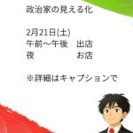 - 政治家の日常 2月17日(水)政治家の見える化 2月17日(火)午前 打ち合わせ※お店午後 打ち合わせ※商店街夜 お店 お店の今後に… 続きを読む: 政治家の日常 2月17日(水)