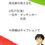 - 政治家の日常 2月27日(金)政治家の見える化 2月27日(金)一日中 キッチンカー お店 実は一般党員や後援会のメンバー… 続きを読む: 政治家の日常 2月27日(金)