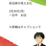 - 政治家の日常 3月29日(日)政治家の見える化 3月29日(日)一日中 お店 日本維新の会公認候補がでていた上田市議選投開票の日。残念なが… 続きを読む: 政治家の日常 3月29日(日)