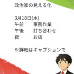 - 政治家の日常 3月17日(火)政治家の見える化 3月17日(火)一日中 家族との時間 事務作業 本来は建設企業委員会の管内視察でした。… 続きを読む: 政治家の日常 3月17日(火)