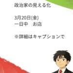 - 政治家の日常 3月20日(金)政治家の見える化 3月20日(金)一日中 お店 歓送迎会シーズンプライベートも仕事も飲み会や総会など忙しい時… 続きを読む: 政治家の日常 3月20日(金)