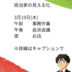 - 政治家の日常 3月19日(木)政治家の見える化 3月19日(木)午前 事務作業午後 会派会議夜 お店 今後の活動や委員会などの共有を… 続きを読む: 政治家の日常 3月19日(木)