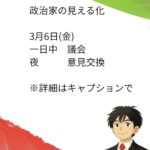 - 政治家の日常 3月4日(水)政治家の見える化 3月4日(水)一日中 議会夜 意見交換 まず議会では、代表質問(5人以上の会派)があり、… 続きを読む: 政治家の日常 3月4日(水)