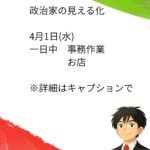 - 政治家の日常 3月31日(火)政治家の見える化 3月31日(火)一日中 事務作業 家族との時間 年度末は銀行が混み合う時期となりま… 続きを読む: 政治家の日常 3月31日(火)