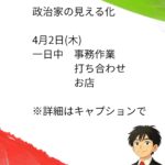 - 政治家の日常 4月2日(木)政治家の見える化 4月2日(木)一日中 事務作業 打ち合わせ お店 令和8年度に変わり、町内… 続きを読む: 政治家の日常 4月2日(木)