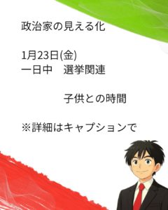 政治家の見える化 1月23日(金)一日中 選挙関連 子供との時間 幸い感染症関係ではなく一晩寝ると元気になった子供。しかし、体調万全ではないので予定していたキッチンカーの予定を中止し、暖かい室内で子供と過ごしながら […]