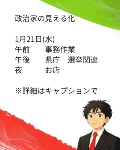 政治家の見える化 1月21日(水)午前 事務作業午後 県庁 選挙関連夜 お店 やると言ったらやり切るただそれだけ ※政治家の見える化とは、政治家が日々何しているかをプライベートや兼業含め可視化する目的です