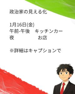 政治家の見える化 1月17日(土)午前 家族の時間午後 お店 新年会なども落ち着き少しゆっくりできるかなと思ったら解散選挙の流れですね、、 皆さんにも関心持ってもらえるように発信していきたいと思います! ※政治家 […]