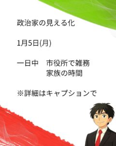 政治家の見える化 1月12日(月)一日中 家族の時間 新年の挨拶問題が話題のようです。個人的には来賓挨拶なんて無くて、その時間を当事者の為になる事をした方がいいのでは? ただ季節の言葉であったり、先人の言葉を聞くのはある […]